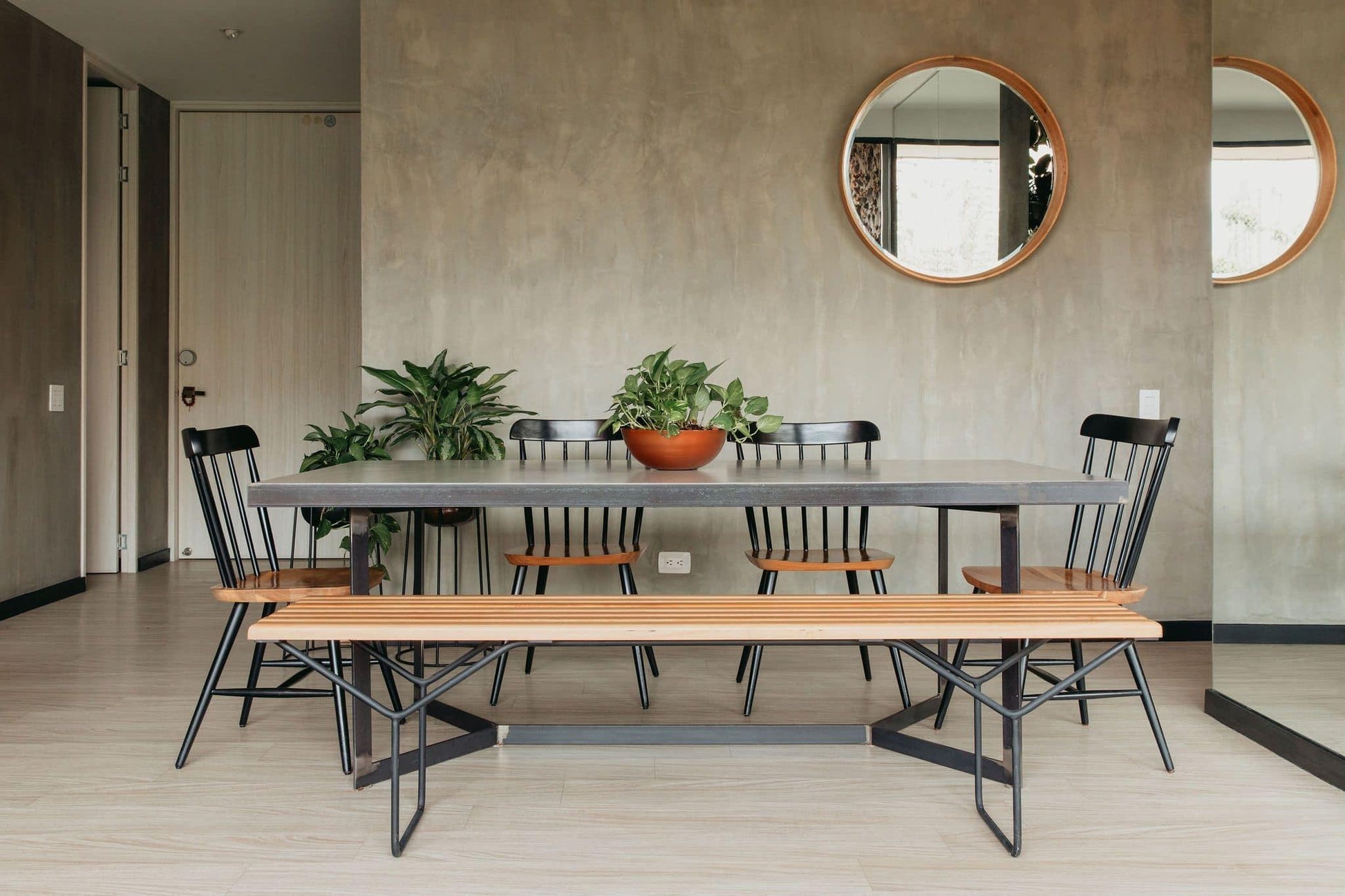 Nuestra banca Varilla en roble tiene una estructura en varilla circular con acabado en pintura electrostática negra.