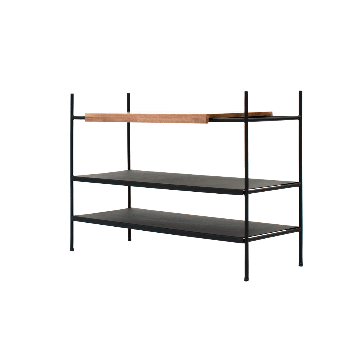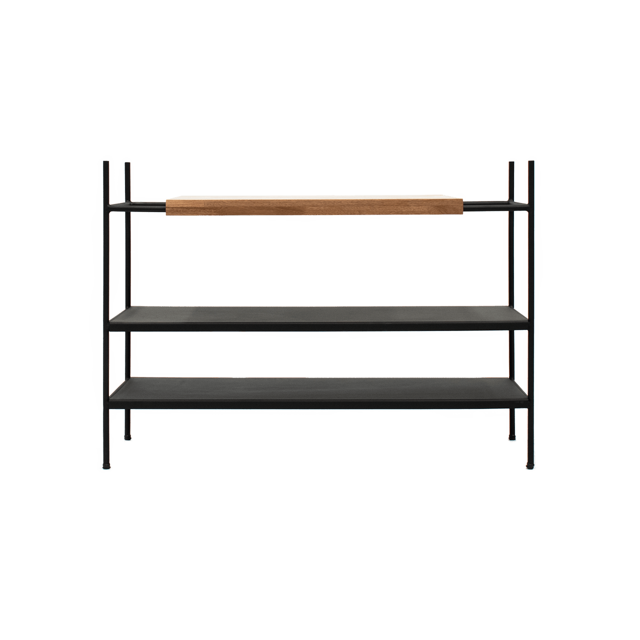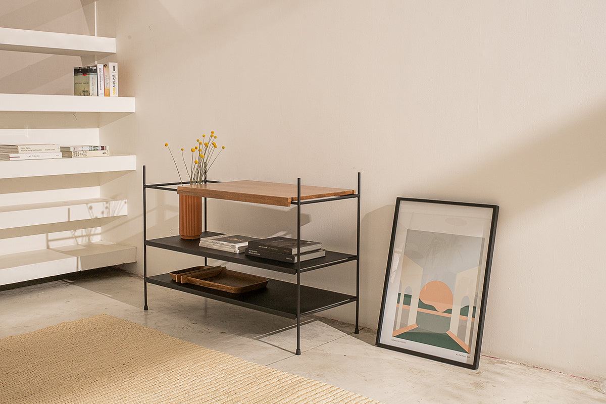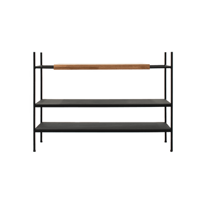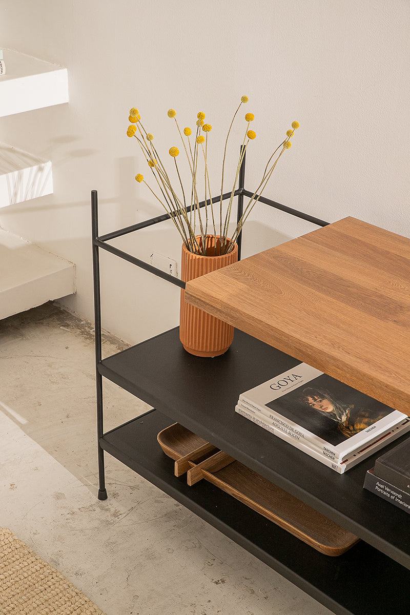 Una clásica estructura en metal, un diseño limpio y un detalle en madera juegan para crear la estantería baja Vik, un práctico y elegante mueble que exhibe los complementos de tu hogar de una forma simplemente cautivadora.