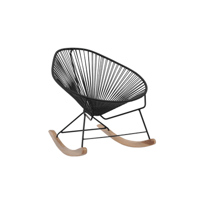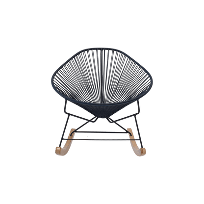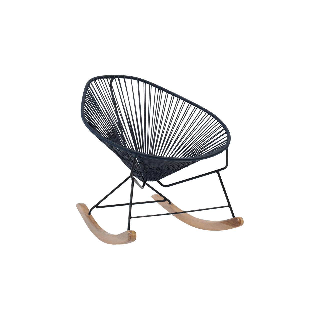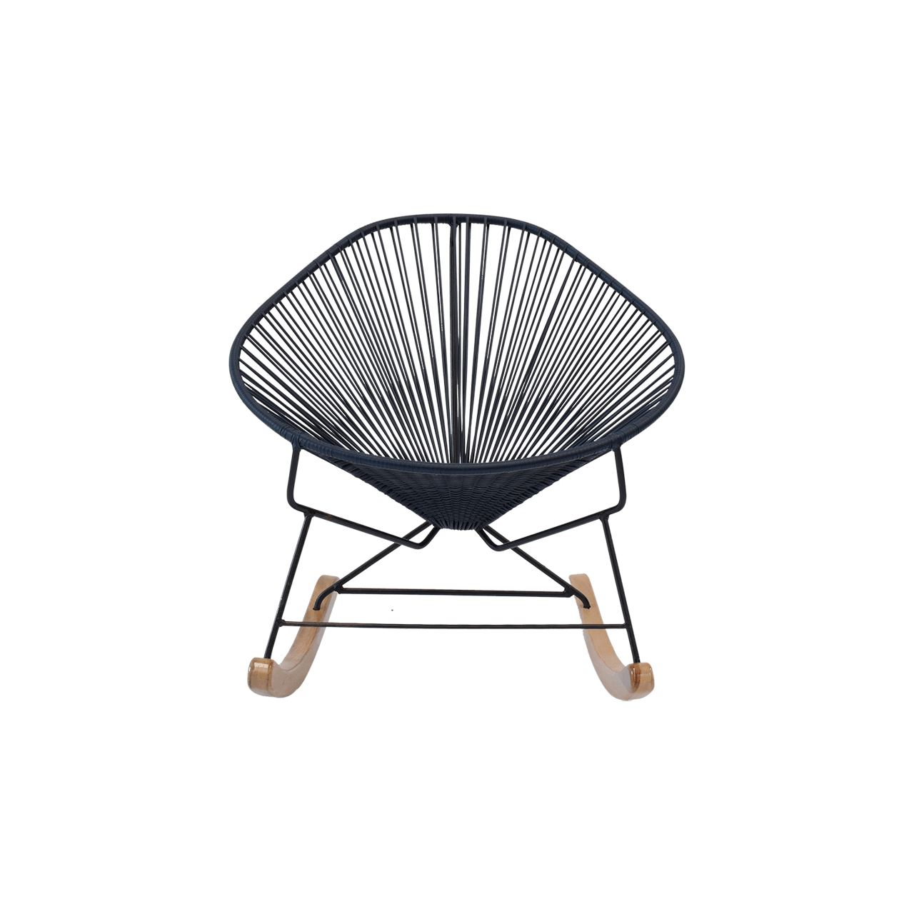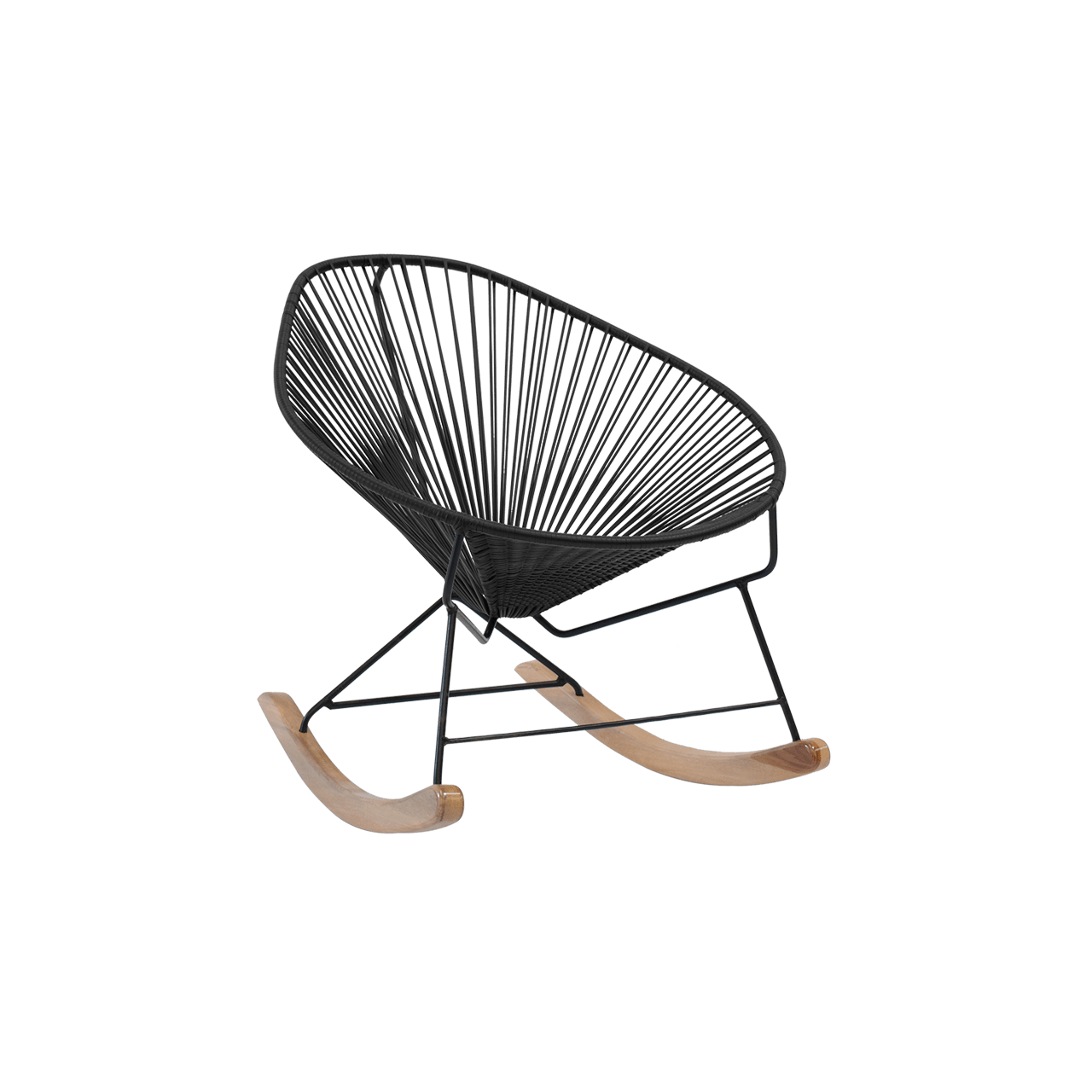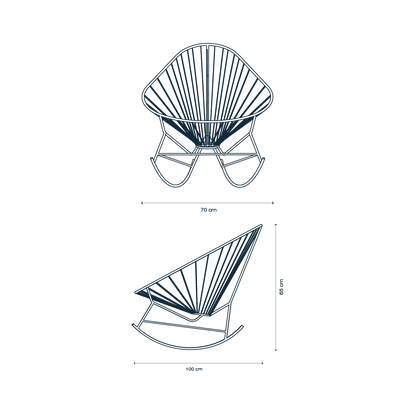 Nuestra silla mecedora Acapulco está hecha de varilla redonda y base en madera, con acabado en pintura electrostática y tejido en plástico PVC.