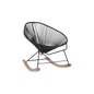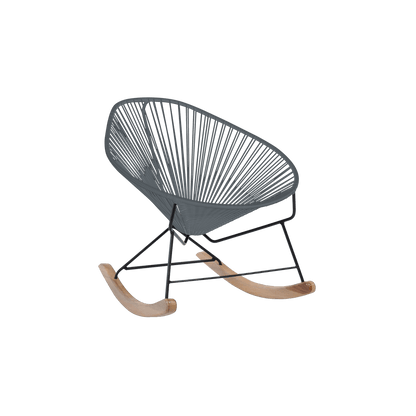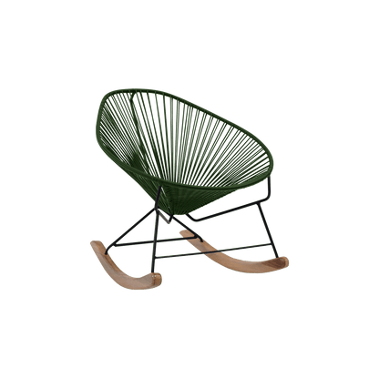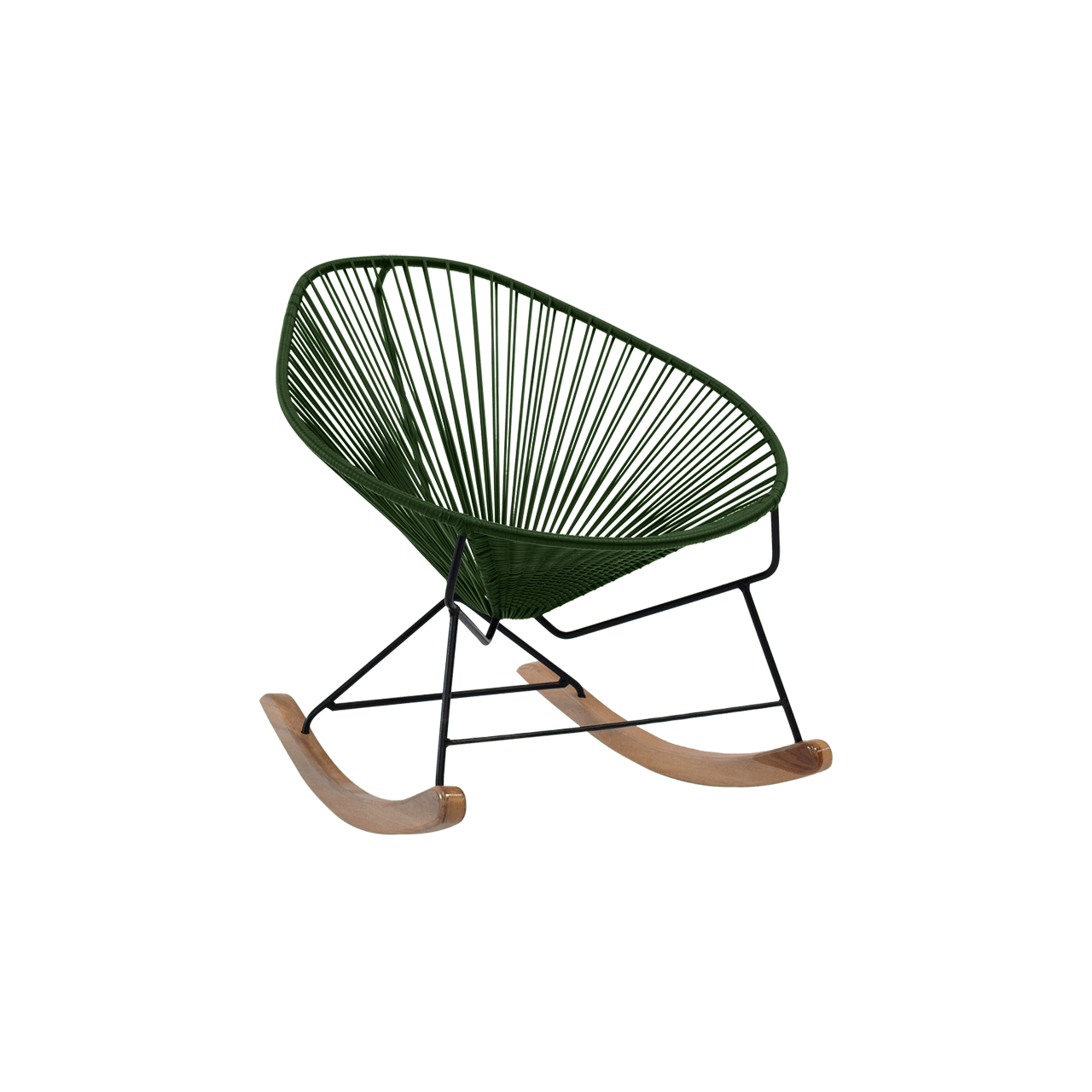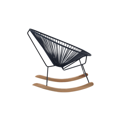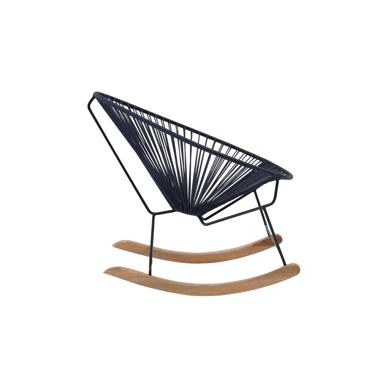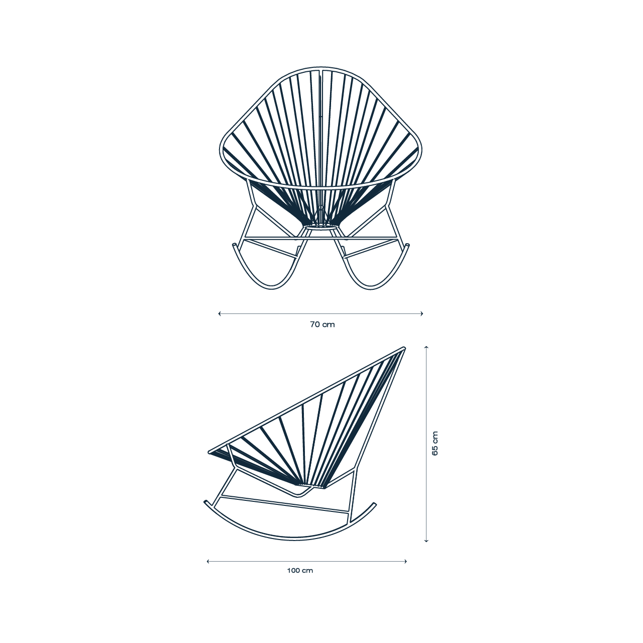 Nuestra silla mecedora Acapulco está hecha de varilla redonda y base en madera, con acabado en pintura electrostática y tejido en plástico PVC.